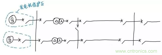 發(fā)電機(jī)接到低壓母線,再通過(guò)升壓變壓器把電壓升高(比如說(shuō)升高成220kV),經(jīng)過(guò)輸電線路輸送到220kV變電站。這里就需要發(fā)電機(jī)保護(hù)、變壓器保護(hù)、母線保護(hù)和線路保護(hù)。對(duì)于發(fā)電機(jī)保護(hù),我們希望發(fā)電機(jī)故障時(shí)只切除故障的發(fā)電機(jī),不影響非故障設(shè)備正常運(yùn)行,而只切除發(fā)電機(jī)出口斷路器就可以實(shí)現(xiàn)只停故障發(fā)電機(jī)的目標(biāo),所以我們把保護(hù)區(qū)的邊界劃到了發(fā)電機(jī)出口斷路器旁邊的電流互感器,如下圖: