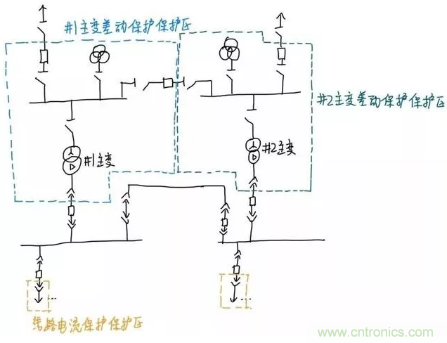 同理,對(duì)于后面的升壓變壓器,斷開(kāi)變壓器兩側(cè)的斷路器可以實(shí)現(xiàn)切除變壓器而不切除其它元件,所以保護(hù)范圍就是變壓器兩側(cè)斷路器旁邊的電流互感器圍成的范圍。