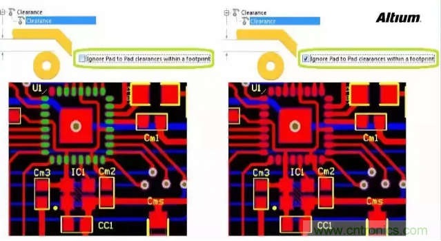 如果整個PCB的最小安全間距設置是8mil,那么元器件焊盤的間距明顯違反了規(guī)則設置。在規(guī)則檢查時或在線編輯時會一直綠色高亮來顯示違規(guī)。這種違規(guī)顯然是不需要處理的,我們應該修正規(guī)則設置來消除綠色高亮顯示。在原來的處理辦法中,是用query語言單獨為這個器件定義不同的安全間距規(guī)則,并設置為高優(yōu)先級。在新的版本中,只需要簡單的勾選選項即可解決這個問題,即忽略封裝內的焊盤間距Ignore Pad to Pad clearance within a footprint。如下圖所示。