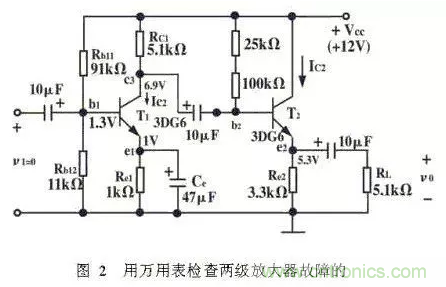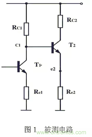 用同一臺測量儀器進行測量時,測量點不同,儀器內(nèi)阻引進的誤差大小將不同。例如,對于圖1所示電路,測C1點電壓VC1時,若選擇e2為測量點,測得VE2,根據(jù)VCl=VE2+VBE2求得的結(jié)果,可能比直接測Cl點得到的VC1的誤差要小得多。所以,出現(xiàn)這種情況,是因為Re2較小,儀器內(nèi)阻引進的測量誤差小。