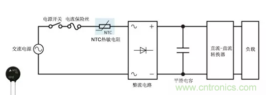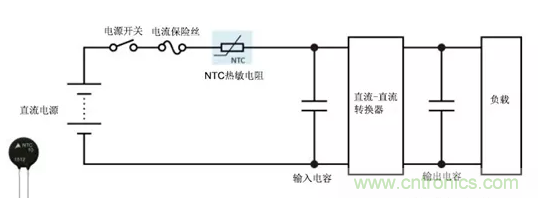 在簡單的直流電源電路(例如直流-直流轉(zhuǎn)換器)中,NTC熱敏電阻可用作電源熱敏電阻并有效地限制沖擊電流,而輸入和輸出電容在電源打開時(shí)即可開始充電。NTC熱敏電阻在通電后其電阻會(huì)大大降低,因此與使用固定電阻相比,其功率損耗更低。