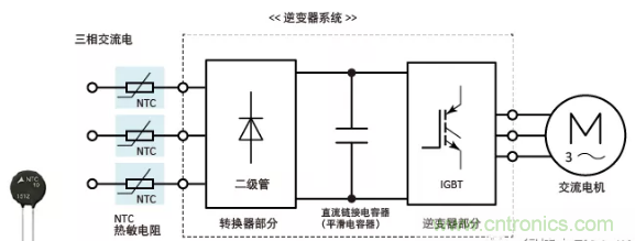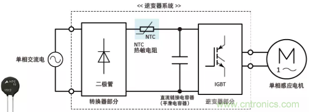 逆變器系統(tǒng)主要由轉(zhuǎn)換器級(jí)、逆變器級(jí)和直流側(cè)電容(平滑電容)組成,該電容放置在轉(zhuǎn)換器級(jí)之后,如下所示。上電時(shí),器件會(huì)通過沖擊電流進(jìn)行充電,而該沖擊電流的峰值是(為直流側(cè)電容充電的)穩(wěn)定電流的若干倍。該沖擊電流可能會(huì)對(duì)直流電容的使用壽命產(chǎn)生不利影響,或損壞半導(dǎo)體器件。為了防止沖擊電流,我們需要連接NTC熱敏電阻。
