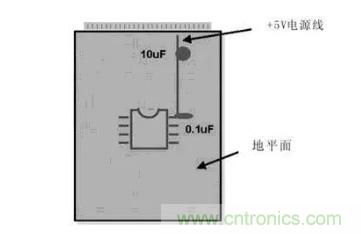 在布線時(shí),模擬器件和數(shù)字器件都需要這些類(lèi)型的電容,都需要靠近其電源引腳連接一個(gè)電容,此電容值通常為0.1uF。系統(tǒng)供電電源側(cè)需要另一類(lèi)電容,通常此電容值大約為10uF。