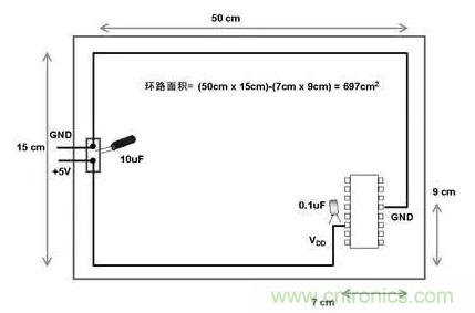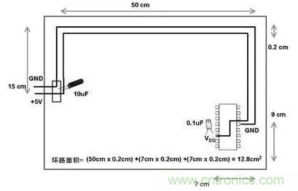 電源線和地線配合不當(dāng)?shù)腜CB設(shè)計(jì)示例如圖2所示,此電路板上,設(shè)計(jì)出的環(huán)路面積為697cm²。采用圖3所示的方法,電路板上或電路板外的輻射噪聲在環(huán)路中感應(yīng)電壓的可能性可大為降低。