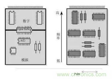 圖4 (左)將數(shù)字開(kāi)關(guān)動(dòng)作和模擬電路隔離,將電路的數(shù)字和模擬部分分開(kāi)。(右)要盡可能將高頻和低頻分開(kāi),高頻元件要靠近電路板的接插件。