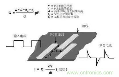 圖5在PCB上布兩條靠近的走線,很容易形成寄生電容。由于這種電容的存在,在一條走線上的快速電壓變化,可在另一條走線上產(chǎn)生電流信號(hào)。