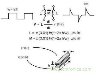 流經(jīng)電路板走線的開(kāi)關(guān)電流將引起電壓發(fā)生變化,電路板走線存在寄生電感,可采用如下公式計(jì)算電壓的變化:V = LdI/dt。其中:V = 電壓的變化,L = 電路板走線感抗,dI = 流經(jīng)走線的電流變化,dt =電流變化的時(shí)間。