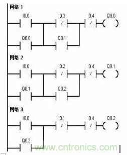 2. 單向順序停止控制電路就是要求按一定順序停止已經執(zhí)行的各機構。只有Q0.2被停止后才可以停止Q0.1,若想停止Q0.0,則必須先停止Q0.1。I0.4為急停按鈕。