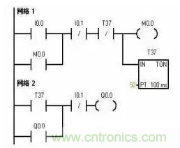 1.延時啟動控制 設計延時啟動程序,要利用中間繼電器(內部存儲器M)的自鎖狀態(tài)使定時器能連續(xù)計時。定時時間到,其常開觸點動作,使Q0.0動作。