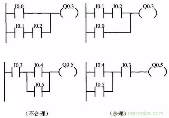 (3)幾個串聯(lián)支路相并聯(lián),應將觸點多的支路安排在上面;幾個并聯(lián)回路的串聯(lián),應將并聯(lián)支路數(shù)多的安排在左面。按此規(guī)則編制的梯形圖可減少用戶程序步數(shù),縮短程序掃描時間。