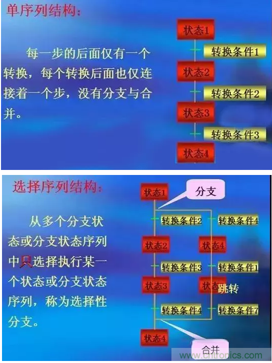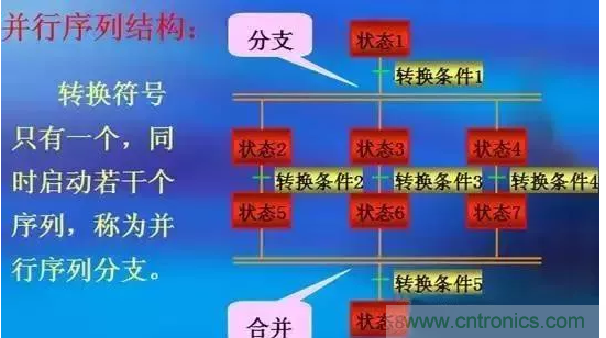 選擇序列的開始稱為分支,轉換符號只能標在水平線之下,每個分支上必須具有一個或一個以上的轉換條件,且具有優(yōu)先級。