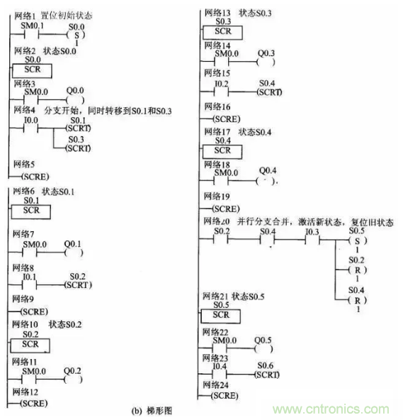 (6)在狀態(tài)發(fā)生轉移后,所有的SCR段的元器件一般也要復位。如果希望繼續(xù)輸出,可使用置位/復位指令。