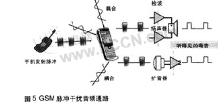 當(dāng)手機(jī)與基站通訊,或兩個(gè)手機(jī)彼此接近時(shí),發(fā)射脈沖通過(guò)擴(kuò)音器,揚(yáng)聲器,或頭戴式耳機(jī)線傳人音頻通路。見(jiàn)圖5。