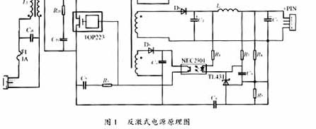 輸入為交流85~200V,經(jīng)功率二極管整流橋變?yōu)橹绷鳎鳛镈C/DC反激變換器的輸入,輸出為三組直流:5V、15V、20V,另外還有一輔助電源5V,用來給光耦NEC2501供電??刂齐娐窞榉答伩刂?,開關(guān)選用TOPSwitch電源芯片(TOP223)。TOPSwitch為三端離線式PWM電源集成控制器,它將PWM控制器與功率開關(guān)MOSFET合為一體,采用TO-220或8腳DIP封裝,除D、C2腳外,其余6腳連在一起作為S端。