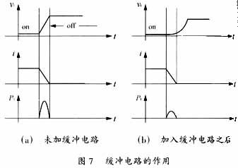 未加緩沖電路和加入緩沖電路之后開關(guān)管電壓Ut和電流i及功耗Pt的波形如圖7所示。由圖7可知,加RC緩沖電路后,開關(guān)電壓上升速率減慢,變小,噪聲減弱,抑制了EMI。另外,開關(guān)功耗變小,使管子不致因過流過熱而損壞。緩沖電路中的R21是在開關(guān)開通,電容C21放電時起到限流作用,避免對管子的沖擊。