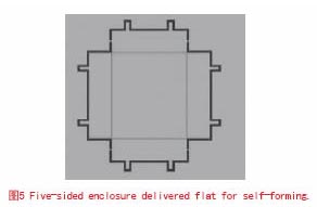 當(dāng)測(cè)試后才進(jìn)行腔體安裝,或PCB板的產(chǎn)量很大時(shí),選擇五面腔體更節(jié)省成本。這種選擇能通過(guò)焊接管腳,點(diǎn)焊角或?qū)附菍?shí)現(xiàn),也可通過(guò)熱回流孔完成加工安裝。迄今為止開發(fā)五面腔體和進(jìn)行少量生產(chǎn)最省錢的方法是選用曲線加工五面腔體。如圖5所示,它是通過(guò)在平板上加標(biāo)識(shí)完成。當(dāng)將它們安裝在PCB板上時(shí),用戶只需將其折疊成想要的形狀即可。