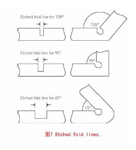 PCM有一些優(yōu)點(diǎn),加工和工具修改花費(fèi)較低,整個(gè)過(guò)程所需要的時(shí)間較短。彎線可以被很精確的蝕刻出來(lái),例如,135,90或者45度,如圖7。整個(gè)過(guò)程沒(méi)有毛邊和金屬應(yīng)力,磁和其他金屬特性不變??梢院芊奖愕挠糜趶?fù)雜的設(shè)計(jì),產(chǎn)品有縫,軌道限界孔,徽標(biāo)和其他細(xì)節(jié)不會(huì)增加最后的費(fèi)用,這可以使設(shè)計(jì)者隨意設(shè)計(jì)他們想要的東西。