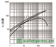 鐵氧體的效果隨著頻率的升高而增加。鐵氧體扼流圈的阻抗在10MHz處通常為幾十歐姆,當頻率超過100MHz時,阻抗升高到數(shù)百歐姆(具體值取決于形狀和尺寸,鐵氧體體積越大,阻抗越大)。不同廠家的產(chǎn)品或同一廠家的不同種類的鐵氧體,其阻抗隨頻率的變化都有所不同。圖5是尺寸相同(外徑為5mm,長度為11mm)但材料不同的兩種鐵氧體的特性。