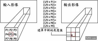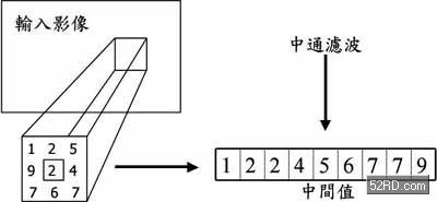 圖說:中值濾波器的運(yùn)作概念示意圖。