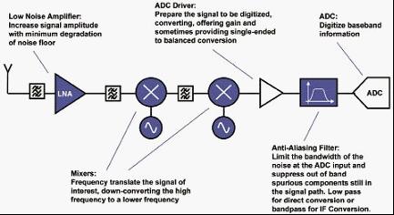 那么,什么樣的設(shè)計是一個較好的射頻系統(tǒng)設(shè)計呢?首先,信號靈敏度要高,這意味著較低的噪聲,時鐘引入的相位噪聲同樣要低。輸入信號要有足夠的驅(qū)動能力,相關(guān)的指標(biāo),如高的三階截點和1dB壓縮點。然后就是各個模塊的性能是否足夠好,是否能較好的區(qū)分信號和噪聲,線性度是否足夠好等等。另外呢就是低功耗低成本等方面的考慮了。