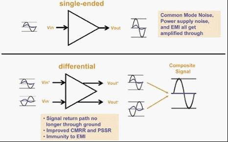 如圖2所示,單端信號會對共模噪聲、電源噪聲和電磁干擾比較敏感,運放會對這些噪聲一定程度的放大。而差分信號由于兩側(cè)信號自身形成電流回路,抑制了共模噪聲和干擾,僅對差模信號進(jìn)行有效放大。