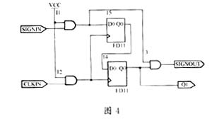 根據(jù)干擾源的情況,以前面所述信號(hào)作為觸發(fā)時(shí)鐘,未經(jīng)處理的信號(hào)源經(jīng)觸發(fā)產(chǎn)生延時(shí),再與其本身相比,這樣,一些干擾信號(hào)由于脈寬過窄而被濾去。具體電路如圖4所示。