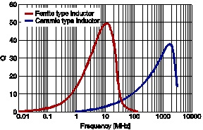 Q值因頻率和基材不同而變化。鐵氧體基材不可用于幾百M(fèi)Hz以上的頻率范圍,應(yīng)采用陶瓷介質(zhì)。