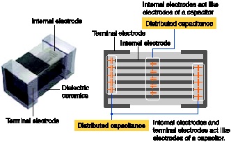 手機(jī)高頻電路系統(tǒng)的電感應(yīng)具有高Q值和小尺寸。然而遺憾的是,如果將線圈變小達(dá)到更微小體積,則造成直流電阻的增加,導(dǎo)致低Q值。另外,更高的頻率范圍的內(nèi)部電極和其它零件的分布寄生電容(未出現(xiàn)在電路圖中的電容)對(duì)Q值的影響很大。線圈感抗(X)與線圈電感和頻率成正比,采用方程式X=2πfL來(lái)定義。理想的電感是指電感值為常數(shù)時(shí),感抗和頻率成正比。因此,頻率和電抗對(duì)比的繪制圖應(yīng)成一條直線,然而在實(shí)際中,更高頻率位置電抗下降,而線圈的分布電容正是造成這一現(xiàn)象的原因。在積層電感中,繞線圖案的作用類(lèi)似電容電極,會(huì)產(chǎn)生分布電容(圖表二)。同樣,分布電容也存在于端子電極和繞線圖氨之間。