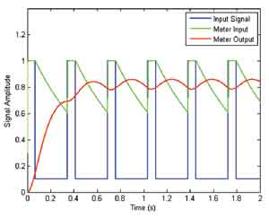 為幫助查看準峰值檢波器與相關儀表組合的響應,圖2把輸入響應(重復脈沖,用藍色表示)、得到的準峰值檢波器響應(具有響應快、衰減慢的特點,用綠色表示)及檢波器與儀表的綜合響應(用紅色表示)分開。