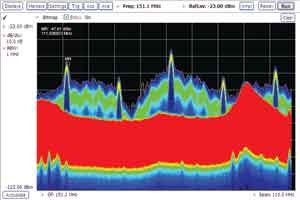 圖7 使用DPX在5s后發(fā)現(xiàn)的偶發(fā)瞬態(tài)信號。紅色區(qū)域是頻繁發(fā)生的信號,藍色部分和綠色部分是瞬態(tài)信號