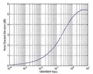 指定視頻濾波器關閉(或不小于3倍RBW)的目的,是為了消除視頻濾波器對檢測到的信號的影響。圖4是視頻帶寬(VBW)與RBW之比變化時視頻帶寬的影響。在VBW≥3*RBW或10*RBW(或失效)時,噪聲標準偏差保持在5.4dB.在VBW=RBW時,例如在TELEC規(guī)范部分章節(jié)中,噪聲變化降低到大約4.7dB.