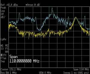幸運的是,測量技術的發(fā)展已經(jīng)可以滿足這些需求。上面介紹了如何使用實時頻譜分析儀發(fā)現(xiàn)瞬態(tài)信號和EMI隱患。在下面的實例中,單個的瞬態(tài)信號會產(chǎn)生一串瞬態(tài)信號,這些信號每次只持續(xù)很短的時間。在本例中,該設備是一種嵌入式系統(tǒng),在把數(shù)據(jù)緩存到硬盤時導致了瞬態(tài)EMI.在使用掃頻分析儀的峰值檢波器簡單檢查后(黃色軌跡,如圖6所示),似乎只有一個連續(xù)信號;把儀器保持Max-hold幾分鐘,同時循環(huán)DUT工作模式,會指明問題(藍色軌跡)。但在峰值檢波模式下進行快速掃描會得到黃色軌跡,沒有檢測到問題。