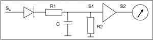 盡管許多EMI測量可以使用簡單的峰值檢波器完成,但EMI測量標準規(guī)定了一種專用測量方法,即準峰值(QP)檢波器。QP檢波器用來檢測信號包絡加權后的峰值(準峰值)。它根據(jù)信號時長和重復率加權多個信號。QP檢波器的特點是響應快、衰減慢,包含一個表示臨界阻尼表的時間常數(shù)。發(fā)生頻次較高的信號,其QP測量值要高于偶發(fā)的脈沖。