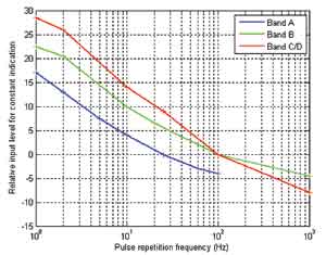 對于帶有QP檢波器的接收機上的常數(shù)指標,圖3表明了CISPR 16-1-1標準描述的幅度和重復頻率之間的關系。