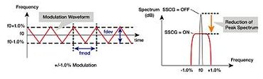 某一大型半導體廠商在解串器的并行總線上實現(xiàn)了SSCG功能。SSCG功能能夠通過將輻射峰值能量擴展到更寬的頻帶上來減少輻射。如下面的圖1所示,頻率變化發(fā)生在額定時鐘中心頻率(中心擴頻調(diào)制)附近,擴展的頻譜為正或負1.0%(fdev)。在接收器并行總線端,輸出以千赫茲(fmod)的調(diào)制速率隨時間調(diào)制時鐘頻率和數(shù)據(jù)頻譜。定制的串行解串器芯片組的目標客戶是要求所安裝電子設(shè)備具有低EMI輻射特性的汽車廠商。