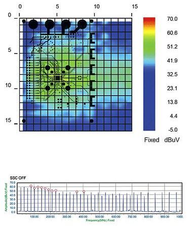 該公司期望用令人信服的量化證據(jù)來向汽車廠商說明SSCG功能可以有效降低EMI輻射。為了實現(xiàn)這個目標,設(shè)計團隊首先在SSCG功能為“關(guān)”的情況下將待測器件(DUT)放其內(nèi)部掃描儀上,加電,然后在PC中捕獲輻射特性。為了進行有效的對比,在打開SSCG功能的情況下,對同一待測器件進行了掃描。