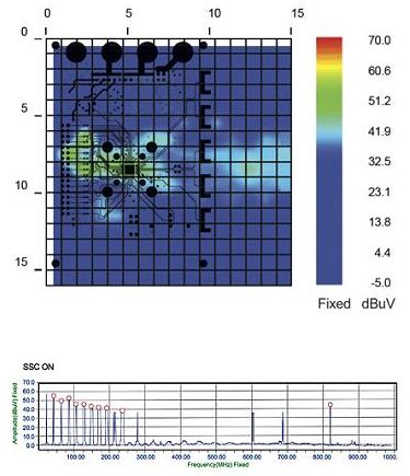 極近場掃描系統(tǒng)完成了空間和頻譜掃描后顯示并生成了以下輻射特性圖。需注意的是,掃描結(jié)果疊加在Gerber設(shè)計文件上,因此這樣對結(jié)果進行分析可以立即確定待測器件中的具體輻射體。圖2顯示了SSCG功能為“關(guān)”時待測器件的輻射特性。