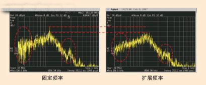 從圖中可見,在處理D類固有的周期性方波時,最基本的難題是諧振間隔時出現(xiàn)的集中能量。為了設(shè)計一個“安靜”的低EMI D類放大器,一個方法是將頻率來回抖動,或擴展開關(guān)的頻譜,降低頻譜內(nèi)所有點上的能量。與傳統(tǒng)的D類放大器相比,擴頻調(diào)制方案有幾個重要的優(yōu)點:除了可保持高效效率和低THD+N外,更重要的是大幅削減了輻射噪聲和EMI,如圖6中所示。