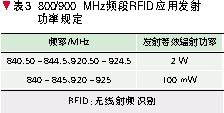 信息產(chǎn)業(yè)部于2007年4月23日發(fā)布了信部無[2007]205號文件《關(guān)于發(fā)布800/900 MHz頻段射頻識(shí)別(RFID)技術(shù)應(yīng)用試行規(guī)定的通知》,規(guī)定800/900 MHz頻段RFID技術(shù)的具體使用頻率為840~845 MHz和920~925 MHz.表3給出了發(fā)射功率的規(guī)定。