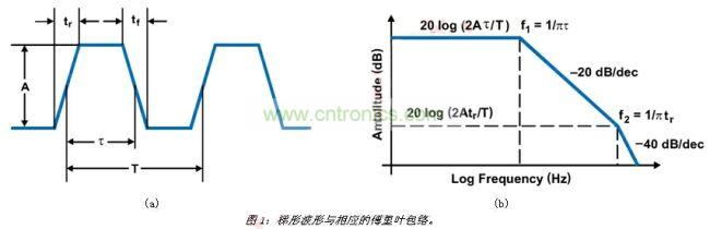 對于CCM中運作的降壓轉換器,電感電流一直是非零的正電流。在這種情況下,負載周期為D=Vout/Vin,在本例中為38%(5V/14V)。使用200kHz的開關頻率時,我們很快計算出導通時間為1.8μs。為支持此頻率,控制開關的上升/下降時間必須小于90納秒。這使得我們注意到第一個減少噪聲的方法,也就是斜率控制。您可能還無法理解,但是此時我們非常了解與PWM切換節(jié)點有關的諧波,也就是開關穩(wěn)壓器的控制波形。如果將此波形以圖1(a)中所示的梯形表示,波形的諧波便能夠以圖1(b)中的內容表示,這表明了EMI背后的驅動因素。這一傅里葉包絡定義了可通過傅里葉分析或計算梯形波形導通時間及上升時間取得的諧波振幅。