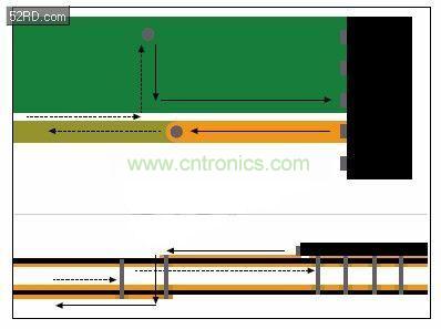 流經(jīng)所布線路的所有電流都有相等的回流。耦合策略固然很多,不過回流通常流經(jīng)相鄰的接地層或與信號(hào)線路并行布置的接地。在參考層繼續(xù)時(shí),所有耦合都僅限于傳輸線路,一切都非常正常。不過,如果信號(hào)線路從頂層切換至內(nèi)部或底層時(shí),回流也必須獲得路徑。