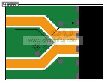 時(shí)鐘分布或合成器設(shè)備路由出來、用于承載相同頻率的跡線集群可能相鄰而行,因?yàn)楦蓴_源音調(diào)已經(jīng)存在于接收器線路上。不過,分組的線路最終會(huì)分散。分散時(shí),應(yīng)在分散線路之間提供接地灌流,并在其開始分散的地方灌入通孔,以便感應(yīng)回流沿著額定回流路徑流回。在圖3中,接地島末端的通孔可使感應(yīng)電流流到參考層上。接地灌流上其它通孔之間的間隔不要超過一個(gè)波長(zhǎng)的十分之一,以確保接地不會(huì)成為共振結(jié)構(gòu)。