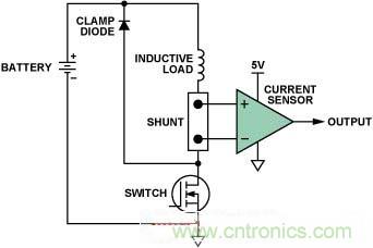 圖1所示為汽車應(yīng)用環(huán)境中用于監(jiān)控電磁閥或其它感性負(fù)載的常見配置。