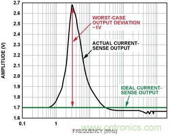 這種情況下,40 MHz時(shí)誤差僅為3 mV左右,且峰值誤差(大于100 MHz時(shí))小于30 mV,性能提高35倍。這點(diǎn)清楚地表明,內(nèi)置EMI濾波電路有助于顯著提高電流傳感器防護(hù)性能,使其免受輸入端存在的高頻信號(hào)影響。在實(shí)際應(yīng)用中,盡管并不清楚EMI的嚴(yán)重程度,但是如果使用內(nèi)置EMI濾波功能的電流傳感器,實(shí)際上控制環(huán)路將會(huì)保持在其容差范圍內(nèi)。