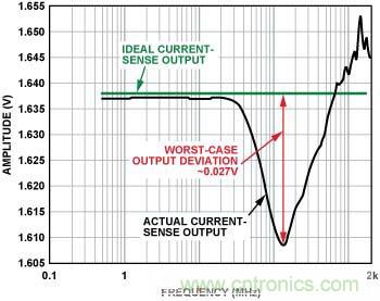 圖3. 電流傳感器輸出 (內(nèi)置EMI濾波器,前向功率 = 12 dBm, 5 mV/分頻,>100 MHz時(shí)直流輸出達(dá)到峰值)