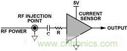 具體而言,這些測(cè)試都采用 “直接功率注入法”完成,這是一種通過電容將RF信號(hào)耦合至特定器件引腳的方法。根據(jù)待測(cè)IC的類型,針對(duì)不同的RF信號(hào)功率水平和頻率范圍,測(cè)試器件的每路輸入。圖4顯示了在特定引腳上執(zhí)行直接功率注入測(cè)試的原理示意圖。