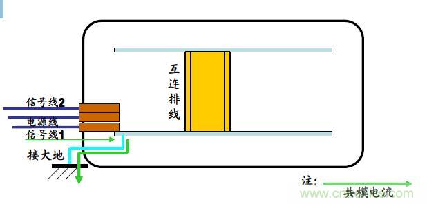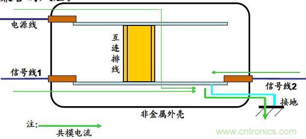 結(jié)構(gòu)和接地也是抑制脈沖群干擾的很重要的方面。圖示為一個非金屬外殼的電子設(shè)備,首先電源線遠(yuǎn)離接地點(diǎn),接地路徑較長,接地效果大大降低。其次,信號線1遠(yuǎn)離接地點(diǎn),導(dǎo)致干擾脈沖施加在電源線和信號線1上時,脈沖群的共模干擾電流要經(jīng)互連線和下面的線路板,最終經(jīng)接地端子入地。由于互連線的阻抗較大,而且接地路徑又長(接地阻抗也大),大大增加了電磁兼容的風(fēng)險。