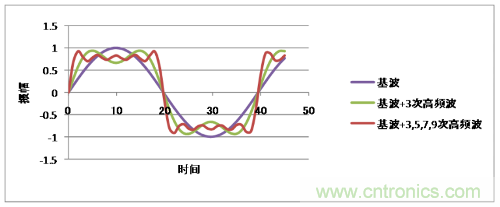 下圖所示的是正弦波的高頻波(擁有基本波整數倍頻率的波)重疊而成的例子,可以看到當高頻波越多圖形就越接近矩形波。矩形波相當于這些高頻波持續(xù)重疊在一起的波紋。