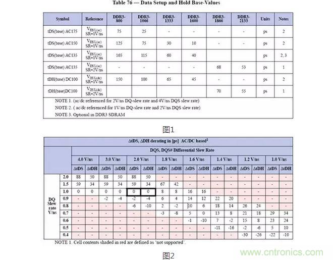 以DDR3信號為例,在JEDEC規(guī)范中規(guī)定了一個(gè)建立保持時(shí)間的基準(zhǔn)值(圖1),還有就是derating值(圖2),兩者之和就是所需的建立保持時(shí)間。