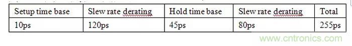 簡單,可以用上面的公式計(jì)算出derating值,但上述公式只適用于>1v/ns的情況。然后和基準(zhǔn)值相加得到總的建立保持時(shí)間,如下表,總共所需的建立保持時(shí)間的總和是255ps。這樣就可以準(zhǔn)確的估算時(shí)序裕量了。